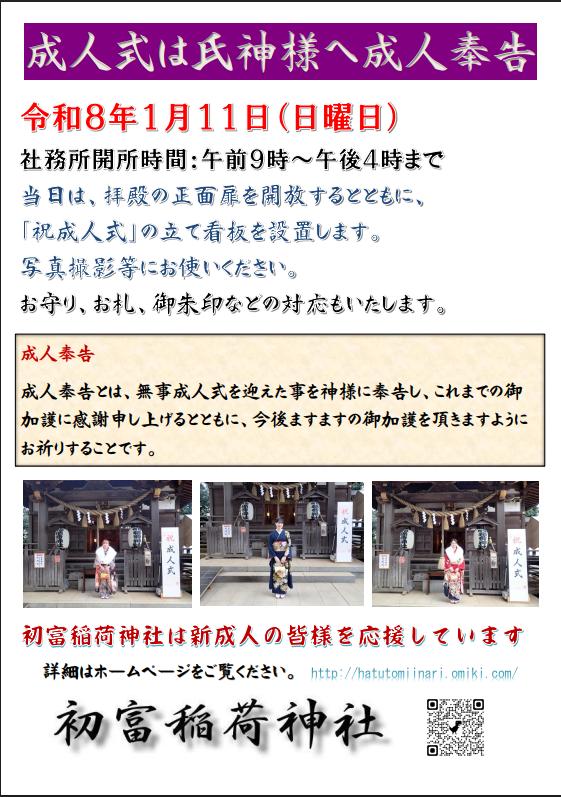 初富稲荷神社ではこれを受け、新成人をお祝いするため、成人式の日に社務所を開所することにいたします。